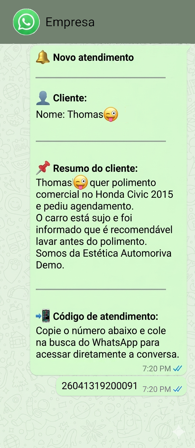 A IA responde imediatamente às perguntas repetitivas, 24 horas por dia, e quando o cliente está pronto para comprar, encaminha a conversa para você — com um resumo completo.